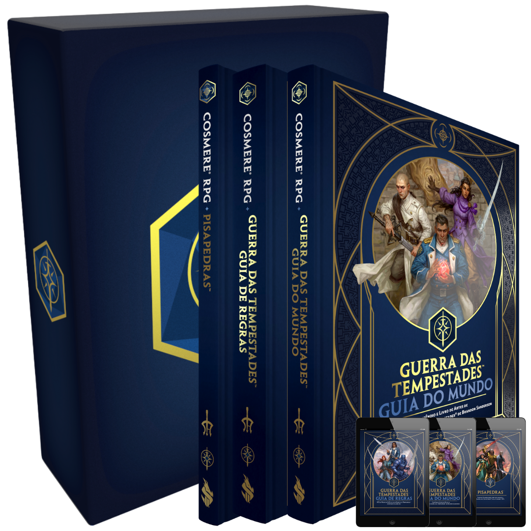 Este box de luxo em edição limitada da pré-venda contém o kit dos três livros básicos do Cosmere RPG: Guerra das Tempestades, sendo: o Guia de Regras, o Guia do Mundo e a campanha Pisapedras (escrita pelo próprio Brandon Sanderson).